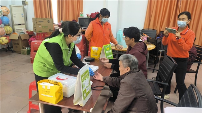 (图片说明:大参林志愿者为大塘敬老院长者开展健康检测服务)