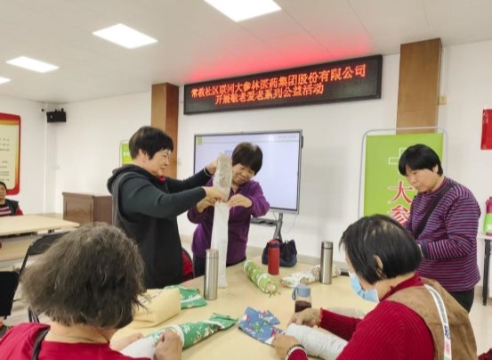 随后,大参林志愿者与长者们一同开展艾草养生枕DIY活动。大参林志愿者备好物料,手把手指导制作,同时简单讲解艾草枕的养生功效与用法。